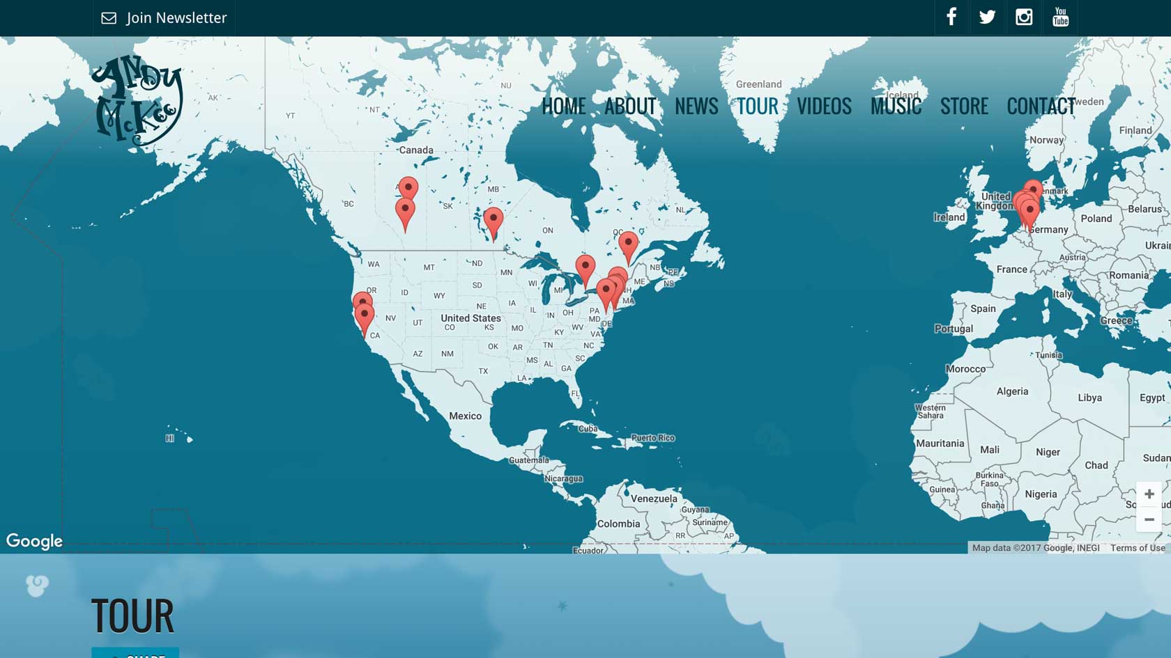 Andy McKee plays all over the world, so when he wanted a tour dates listing, I immediately thought we should map it out.