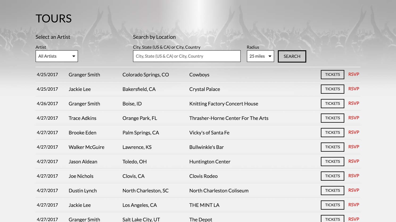 One of the best features of this wrapper is the ease in which you can call for data on multiple artists. That allowed me to quickly create a tour date listing for all of Broken Bow Records Music Groups artists in one filterable list.