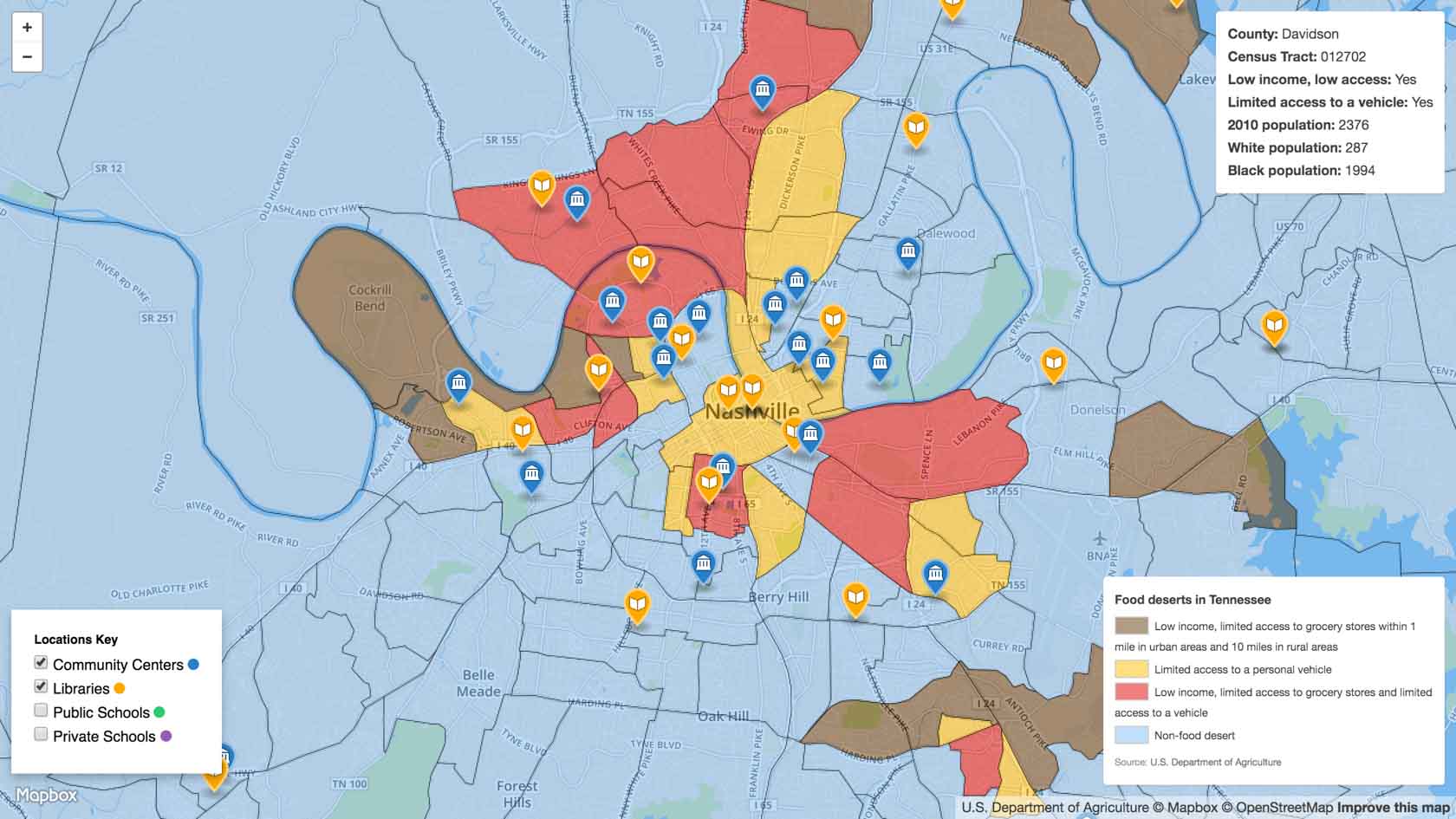 The Local Collaborative wants to make locally grown and produced goods available to everyone, especially to those who live in areas with limited access to grocers and transportation. We've been working on a partnership with Community Centers, Libraries, and Public and Private Schools as potential pick up locations, specifically in food deserts. Since accepting SNAP benefits online is still unavailable, the hope is we can handle SNAP transactions at affiliate pick up locations. In order to really understand the viability of such an idea, we populated a map of the Nashville area with potential pickup locations and the USDA's data on food deserts.